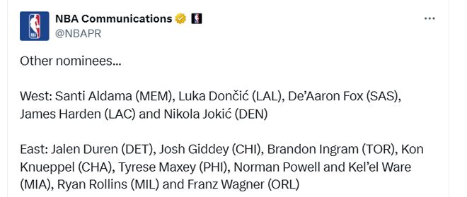 西部:阿尔达马(灰熊)、东契奇(湖人)、福克斯(马刺)、哈登(快船)、约基奇(掘金)