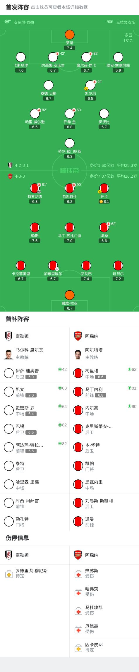 第64分钟,萨卡禁区内过人后射门,球被莱诺扑出
